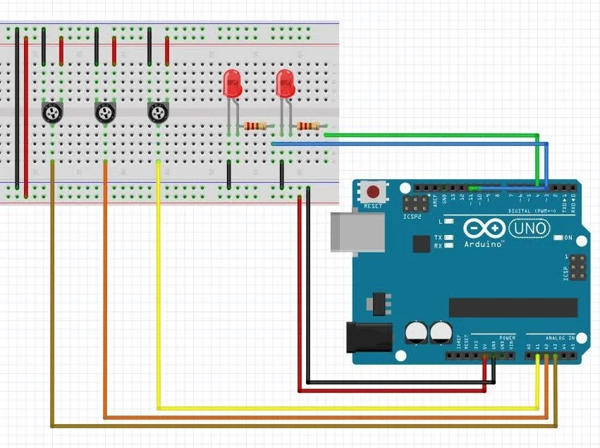 That all said, I put together a circuit with two LEDs and three potentiometers to get started on figuring out how to set up the code. And that’s where I discovered the aforementioned problem that broke my brain a little. The circuit I used can be seen below. It (mostly) works - yay. I still don’t know what to do with the third potentiometer yet though.