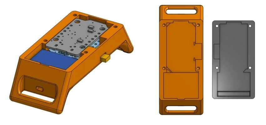 It was becoming clear that the size of the shield needed to change if the case was going to shrink any more. So, a new PCB was ordered that had the same footprint and thickness as the Trinket. The new case was designed so that the battery could sit next to the PCB assembly and room was left for a battery connector.